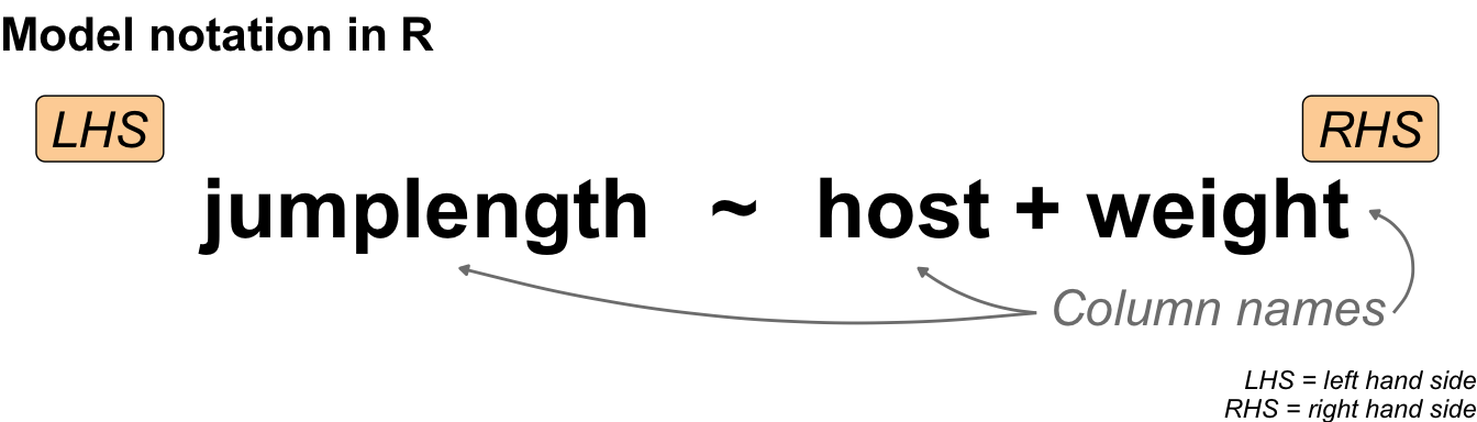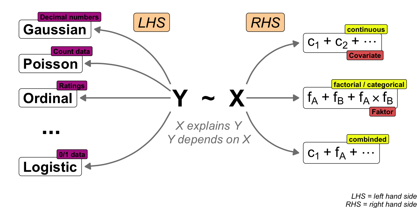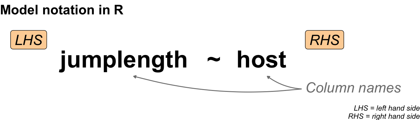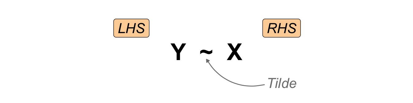 #| fig-cap: "Visualisation of a theoretical statistical model with respect to the programming language R, with the outcome shown on the left-hand side (LHS) and the influencer pictured on the right-hand side (RHS). The two terms are combined by a tilde."