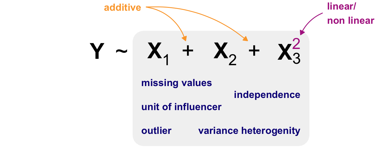 On the left-hand side (*LHS*) we find the outcome. The result of an experiment is called the **outcome**. The outcome is the measured value. Sometimes, using these words can cause you confusion, but for now we'll stick to the idea that the result of something is measured in an experiment. We will discover the outcome on the y-axis later on. Therefore, we abbreviate the outcome to Y. On the right side (*RHS*), you will find the **influencer**. The influencer is the thing we are trying to change in the experiment. If you change the influencer, the statistical model will show you the change in the outcome. As the change will be on the x-axis, we abbreviate the influencer to X. More often than not, we have one outcome and multiple influencers.