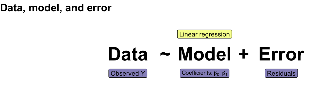 I would like to start with a simple example of a statistical model. Perhaps you would like to see a more concrete example of a model. But first, I will show you the most general form of a statistical model. The model is simple and contains only two terms combined with a tilde. The following @fig-model-general shows how the left-hand side and the right-hand side are connected.