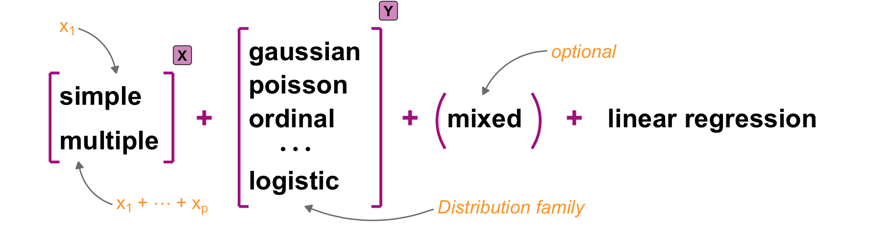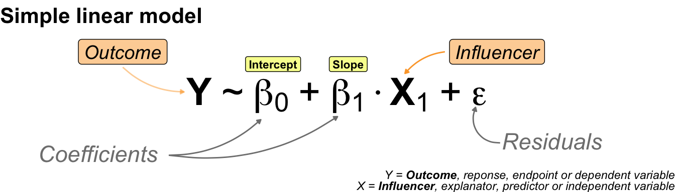 | **outcome**, response, endpoint, dependent variable | $y$ | *The right-hand side (abbr. RHS) of the model. Describing the values measured in an experiment or study. The majority of statistical models should typically have only one outcome variable.* |