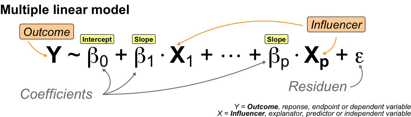 | **influencer**, influential variable, risk factor, fixed effect, independent variable | $x$ | *The left-hand side (abbr. LHS) of the model. Describing the influential variables in an experiment or study. A statistical model can include more than one influencer.* |