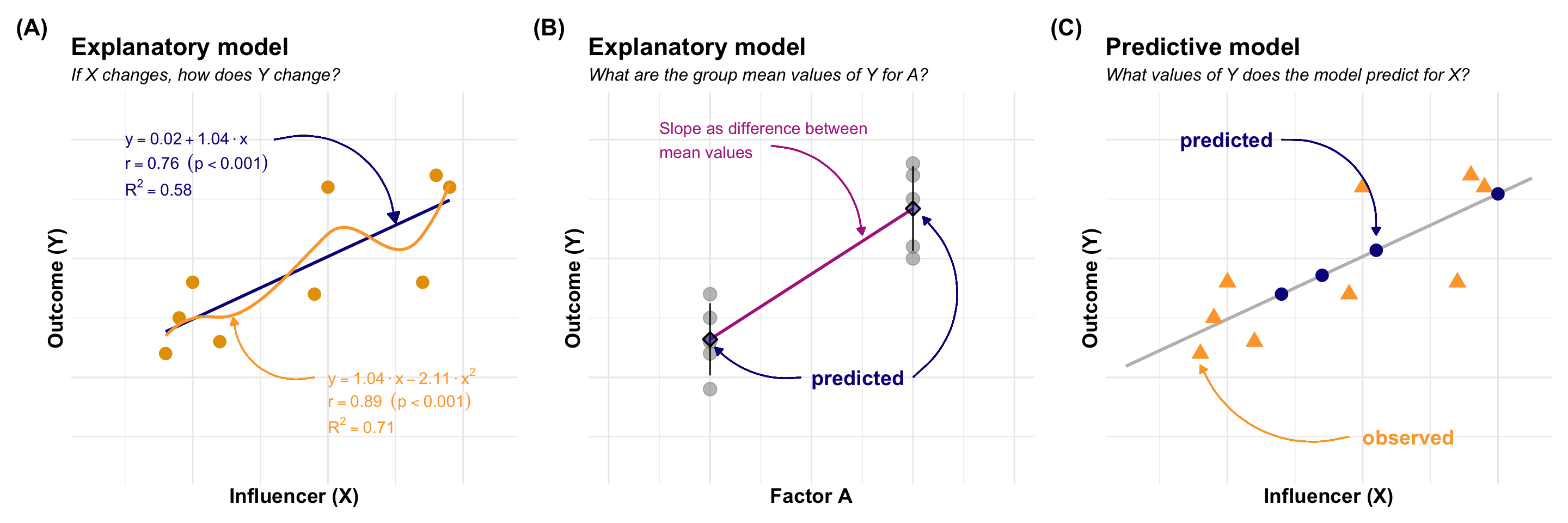 #| fig-cap: "Visualisation of the causal and predictive model in statistical modelling for a simple model. In all cases, the outcome $Y$ is normally distributed. **(A)** *Explanatory model:* How does the outcome y change when the continuous influencer $X$ changes? What is the numerical relationship between $Y$ and $X$? This is a question about the slope of the line. **(B)** *Explanatory model:* How does the outcome $Y$ change when the categorical influencer as factor $f_A$ changes? What is the numerical relationship between $Y$ and $f_A$? This is a question about the slope of the line and the difference between the predicted means of each group. **(C)** *Predictive model:* If $Y$ and $X$ have been measured, what are the values of $Y$ for new $X$ values? Can we use the influencer $X$ to predict new $Y$ outcomes?"
